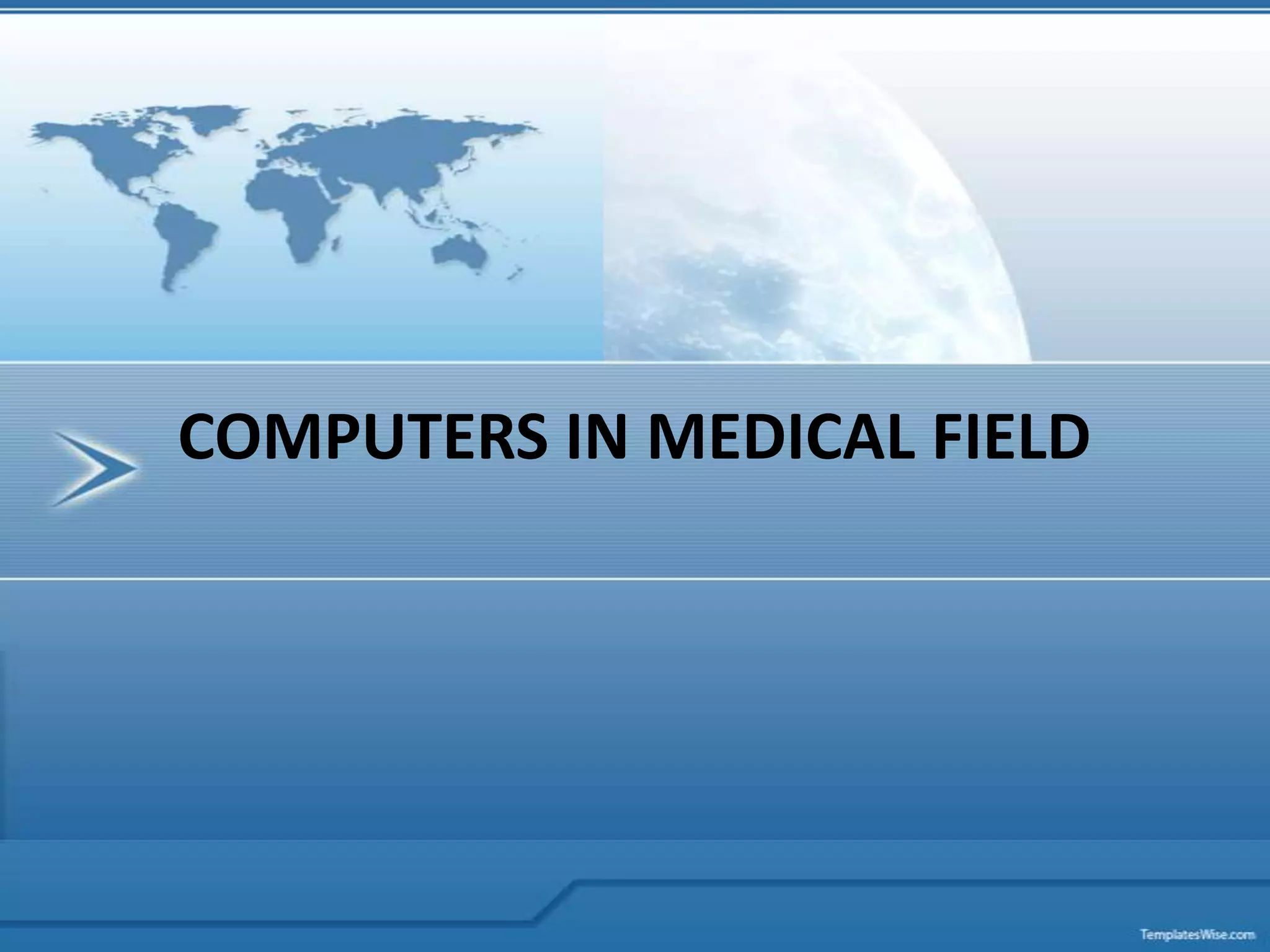 Computers play an important role in the medical field by managing patient records, billing systems, medical imaging, and more. Health informatics applies information science to healthcare by using computers to store and analyze patient data to aid diagnosis and treatment. Computers are used for tasks like maintaining electronic medical records, performing scans like MRI and CT, assisting with surgery, and monitoring devices like pacemakers. While computers provide benefits like improved record keeping and analysis, their use also presents challenges such as high costs and need to ensure security of electronic patient information.
