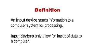 The document outlines various computer input devices, such as keyboards, mice, and graphics tablets, that send data to computer systems for processing. It includes definitions and explanations of devices like microphones, scanners, and digital cameras, as well as technologies like optical character recognition (OCR) and magnetic ink character recognition (MICR). Additionally, it discusses how digitizers convert analog information into digital formats.