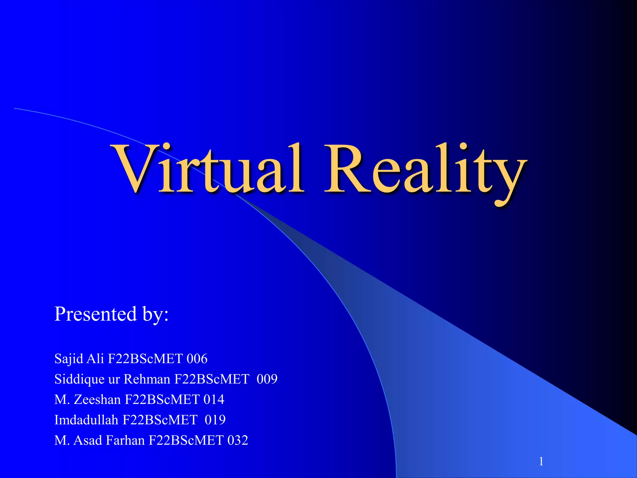 Virtual reality (VR) is an interactive simulation that immerses users in a 3D virtual world. The document outlines the history of VR from early flight simulators to modern commercial systems. It describes types of VR including immersive VR using head-mounted displays and mixed reality. The key technologies that enable VR like head displays, data gloves, and control devices are also discussed. Current applications of VR span entertainment, medicine, manufacturing, and education. While issues remain around simulator sickness and cost, VR offers opportunities for visualization, interaction, and experiencing virtual worlds.