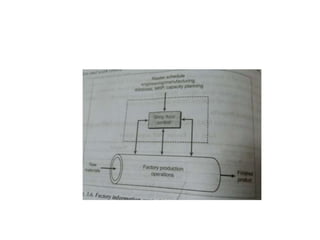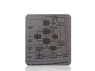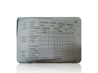 The document discusses computer integrated production planning and control. It defines production planning as forecasting production steps to maximize efficiency. Production control keeps watch over production flow and resources to ensure plans are followed. Key elements discussed include planning, routing, scheduling, dispatching, follow up/expediting, inspection, material requirements planning, capacity planning, shop floor control, inventory control, MRP-II, and just-in-time production. The goals are to integrate inputs efficiently, coordinate activities, and control costs while rationalizing production.