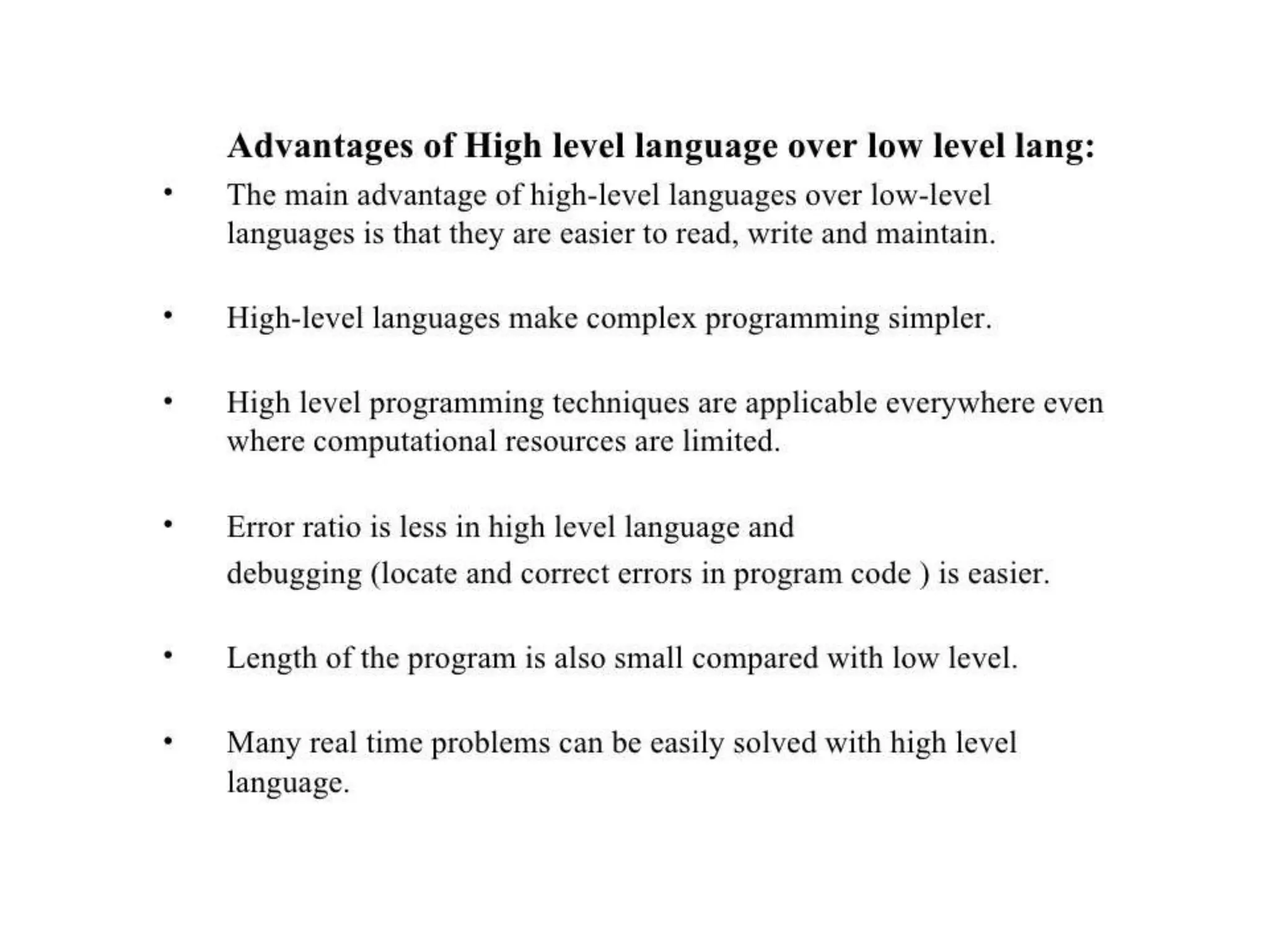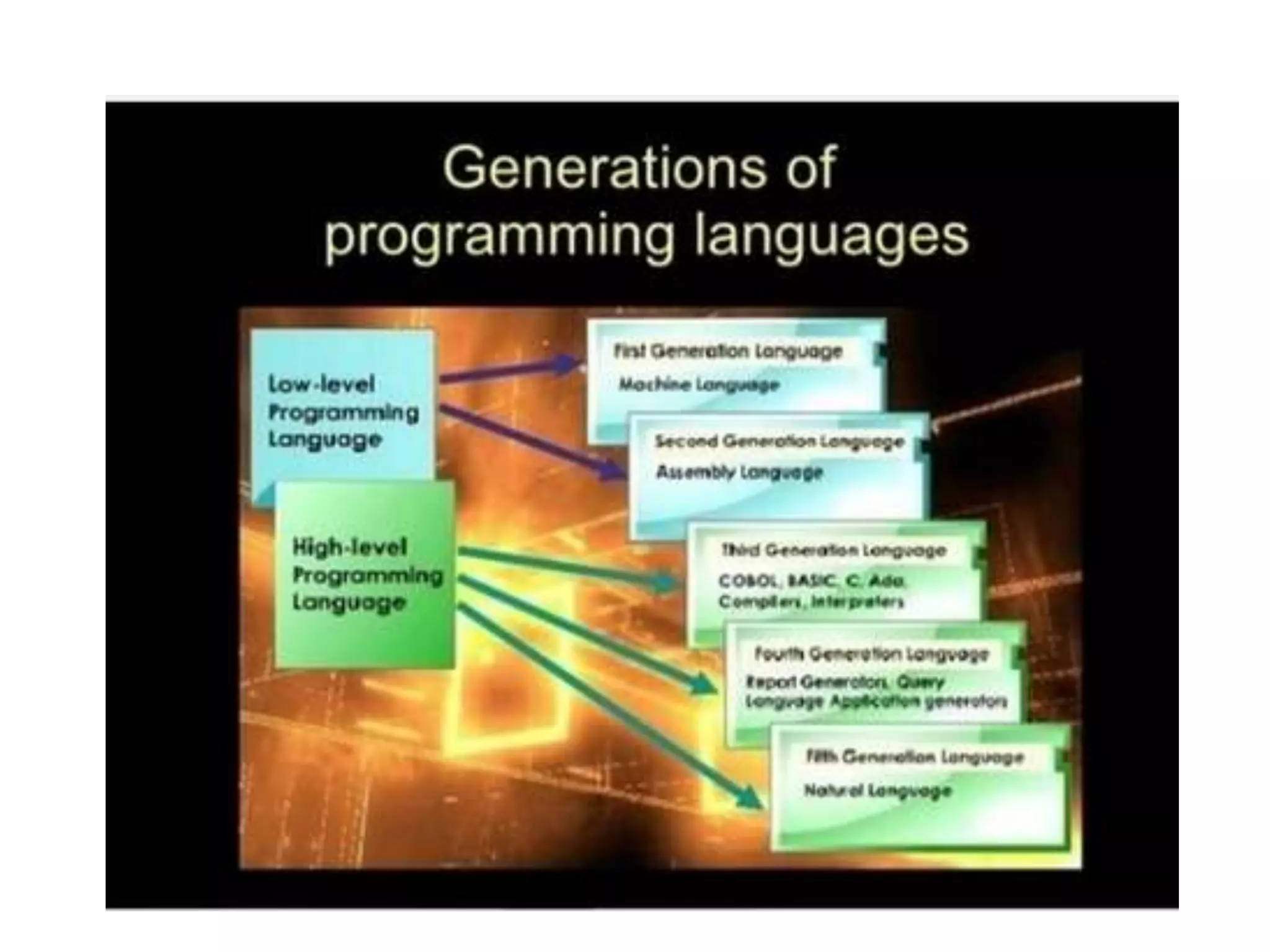 The document explains the concept of computer languages, distinguishing between low-level and high-level languages. It details the evolution of languages from first generation (machine language) to fifth generation, which includes various programming languages and their unique characteristics. Additionally, it describes the role of translators, such as assemblers, interpreters, and compilers, in converting high-level language into machine-readable code.