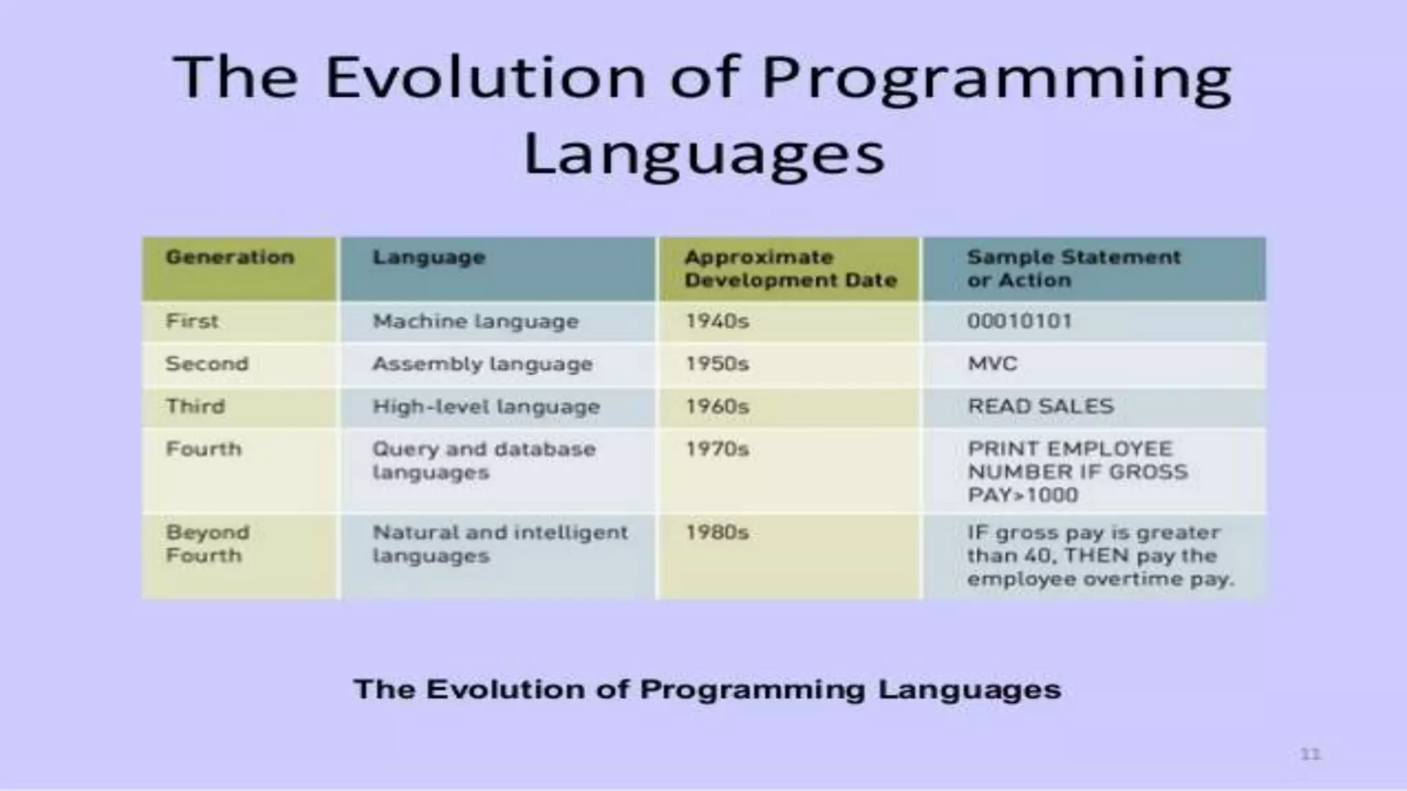 The document discusses different types of computer languages and language translators. There are two main types of computer languages - low-level languages which are close to machine language like assembly, and high-level languages which are closer to human languages like C++ and Java. Language translators like compilers, interpreters, and assemblers are used to translate programs written in high-level and assembly languages into machine-readable object code. Compilers translate the entire program at once while interpreters translate line-by-line, and assemblers specifically assemble assembly language programs into machine code.