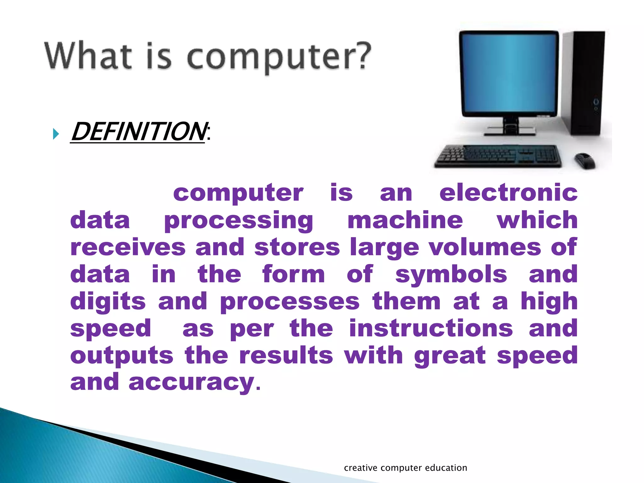 The document defines a computer as an electronic device that receives, stores, and processes data at high speeds according to programmed instructions. It then discusses the key characteristics of computers including their speed, accuracy, reliability, memory capability, and versatility. The document also outlines several common applications of computers in fields like business, education, banking, and more. It provides a basic block diagram of the typical components of a computer including the input, output, and central processing units. Finally, it discusses different generations of computers and how the technology used to build them has developed over time.