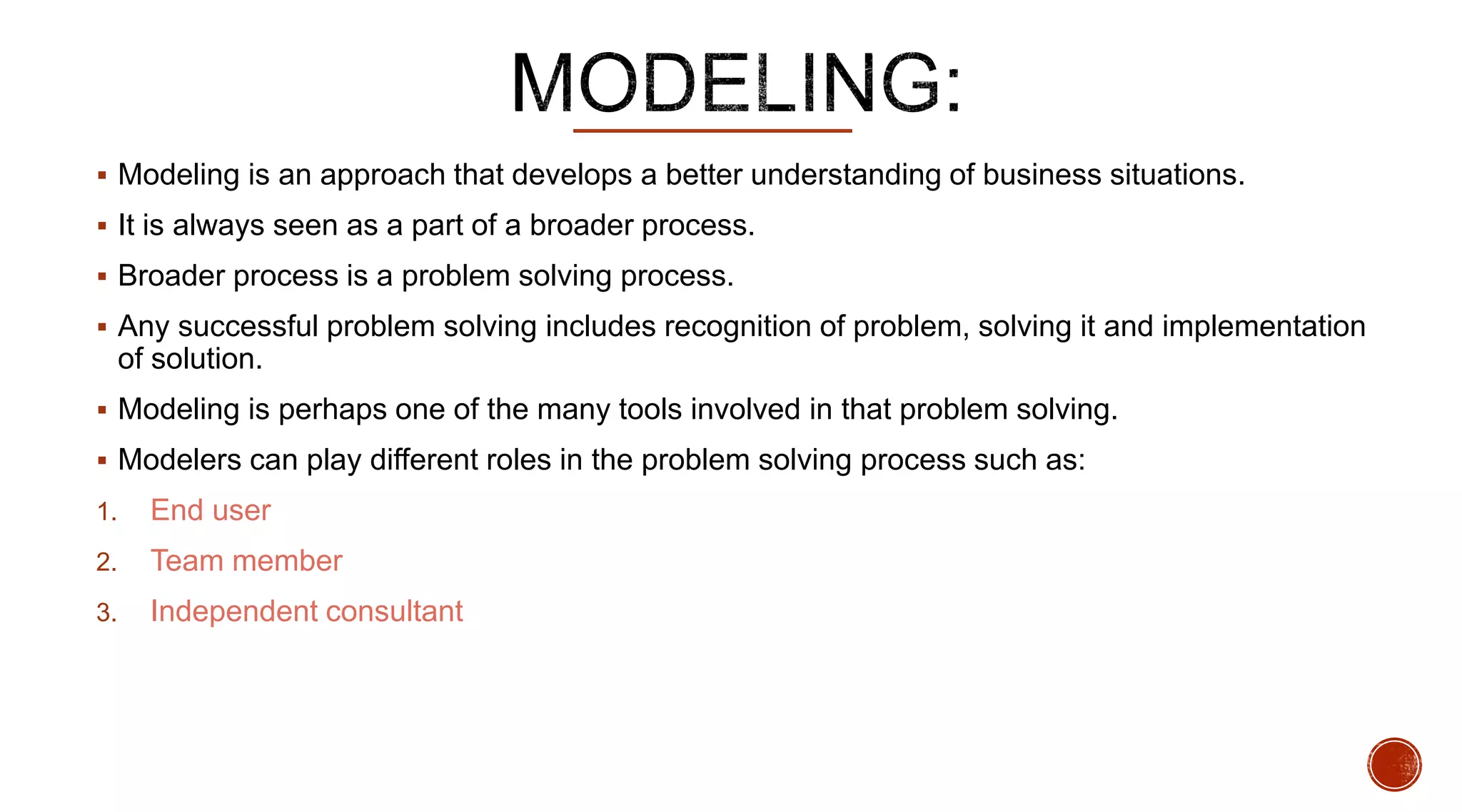This presentation discusses modeling as an approach to problem solving. It outlines the key steps in the problem solving process, which includes recognizing the problem, collecting information, defining the problem, searching for solutions, evaluating solutions, and implementing a solution. Modeling can play a role at various stages of this process. The presentation also discusses mental modeling, the features of models including decisions, outcomes, structure and data, and techniques for becoming an effective modeler such as understanding problem content, model structure, realization, assessment, and implementation. Creativity is also highlighted as an important skill for successful modeling.