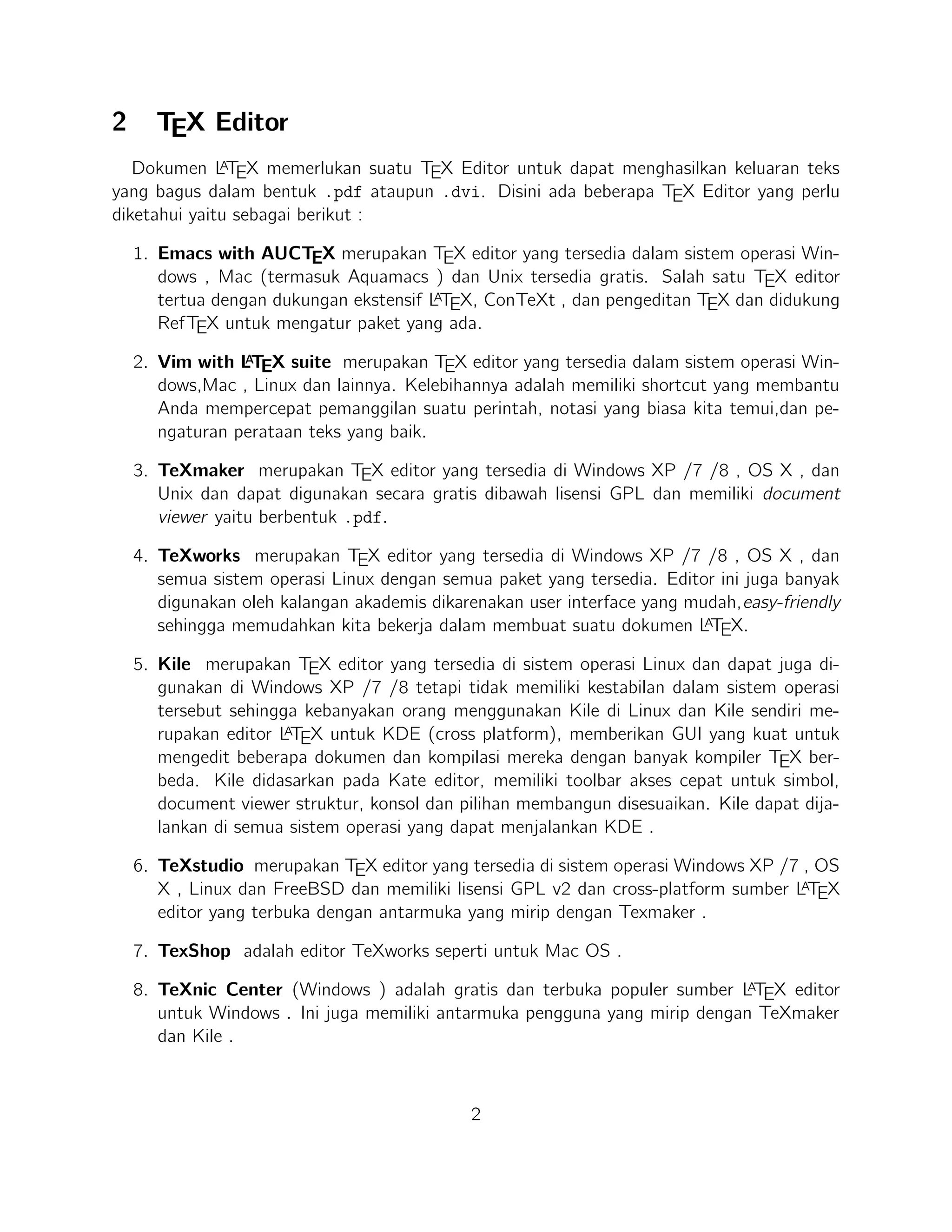 Dokumen tersebut menjelaskan pengertian TEX dan LTEX serta editor-editor yang dapat digunakan untuk mengolah dokumen berbasis LTEX. TEX adalah bahasa pemrograman untuk menghasilkan dokumen dengan notasi matematika yang dibuat oleh Donald Knuth, sedangkan LTEX adalah sistem pengolah dokumen berbasis TEX yang diciptakan Leslie Lamport untuk membuat artikel, jurnal, dan buku. Beberapa editor populer untuk mengolah dokumen L