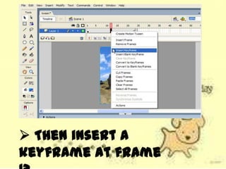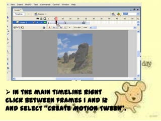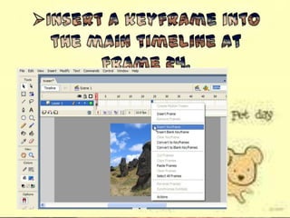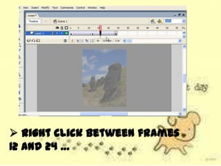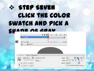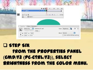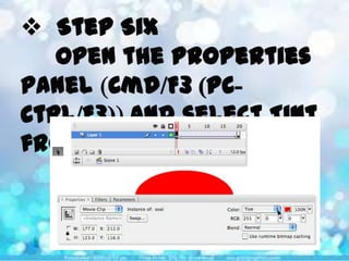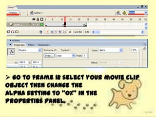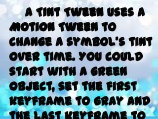 This document discusses different types of tweens that can be used to fade in objects in Adobe Flash, including color overlays, alpha tweens, and tint tweens. It asks the reader to recall that an alpha tween uses a Motion Tween to change the transparency of a symbol over time, and color overlays work well for fading objects over black or white backgrounds, while tint tweens are used to change a symbol's color tones gradually. The document also prompts the reader to list three steps in the process of creating an alpha tween.