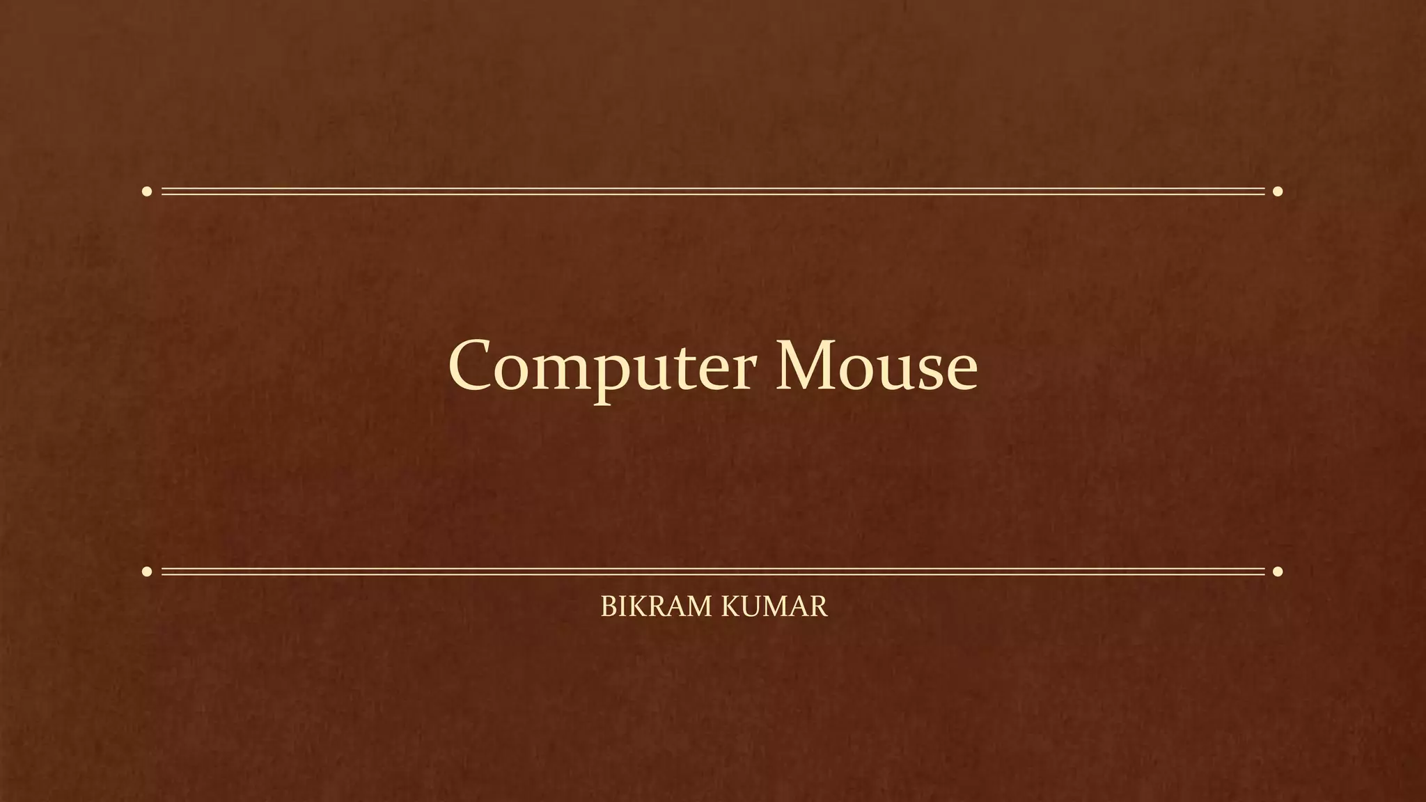 The computer mouse was invented in the 1960s by Douglas Engelbart and patented in 1970. It allowed users to control the cursor and interact graphically with early computer operating systems. The first mouse was made of wood, larger than modern mice, and had a single button. Today's mice usually have two buttons and a scroll wheel and connect to computers via USB or wirelessly. Mice use sensors to track movement across surfaces and translate it to cursor movement on screen. Common mouse types include corded, wireless, optical, and touchpads used with laptops.