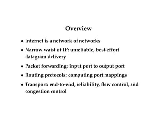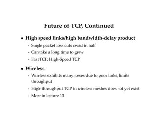 - TCP responds to packet loss through fast retransmit, fast recovery, and halving the congestion window size to reduce congestion according to protocols like Tahoe, Reno, and New Reno.