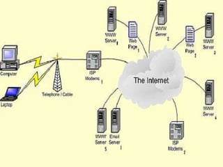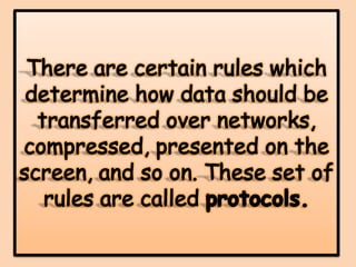 This document provides an overview of computer networking concepts for class 8 students. It defines a computer network and its basic components, including nodes, senders, receivers, and transmission medium. It describes the advantages of networking and different types of networks like LAN, WAN, MAN, and PAN. It also discusses networking media, devices, terminology, and protocols like TCP/IP, HTTP, FTP, and IMAP/POP. The key topics covered include introduction to networks, networking advantages, media, types of networks, devices, terminology, and protocols.