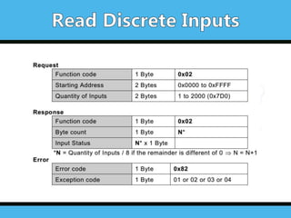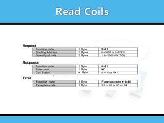 Modbus is a protocol for industrial device communication published in 1979. It operates at layers 5-7 of the OSI model and can run over serial lines like RS-232 and RS-485 or TCP/IP networks. Modbus defines basic operations like reading coils, reading registers, and writing single coils or registers. It uses a client-server model with a maximum protocol data unit size of 253 bytes.