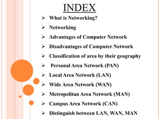 The document outlines computer networking concepts, defining a computer network as an interconnection of computers to facilitate communication and resource sharing. It describes various types of networks including Personal Area Network (PAN), Local Area Network (LAN), Wide Area Network (WAN), Metropolitan Area Network (MAN), and Campus Area Network (CAN), highlighting their advantages and disadvantages. Additionally, it compares LAN, WAN, and MAN based on parameters such as ownership, geographic coverage, and communication medium.
