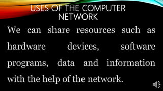 The document discusses the uses and advantages of computer networks. It describes how networks allow users to share hardware devices, software programs, data, and information. Specifically, networks enable sharing of printers, access to files stored on other computers, and use of centralized software programs. The key advantages of networks listed are easy access to information, improved productivity through collaboration, sharing of resources to reduce costs, ability to work remotely, increased security, high reliability, and simpler backups.