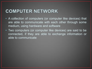 This document provides an overview of computer networks. It defines a computer network as a collection of connected computers that can communicate and exchange information. It describes different types of network connections including simplex, half duplex, and full duplex. It also outlines common network topologies like bus, star, ring, mesh, and tree. Additionally, it explains important networking hardware and standards including network interface cards, switches, routers, Ethernet, Token Ring, FDDI, IEEE 802 standards, and more.