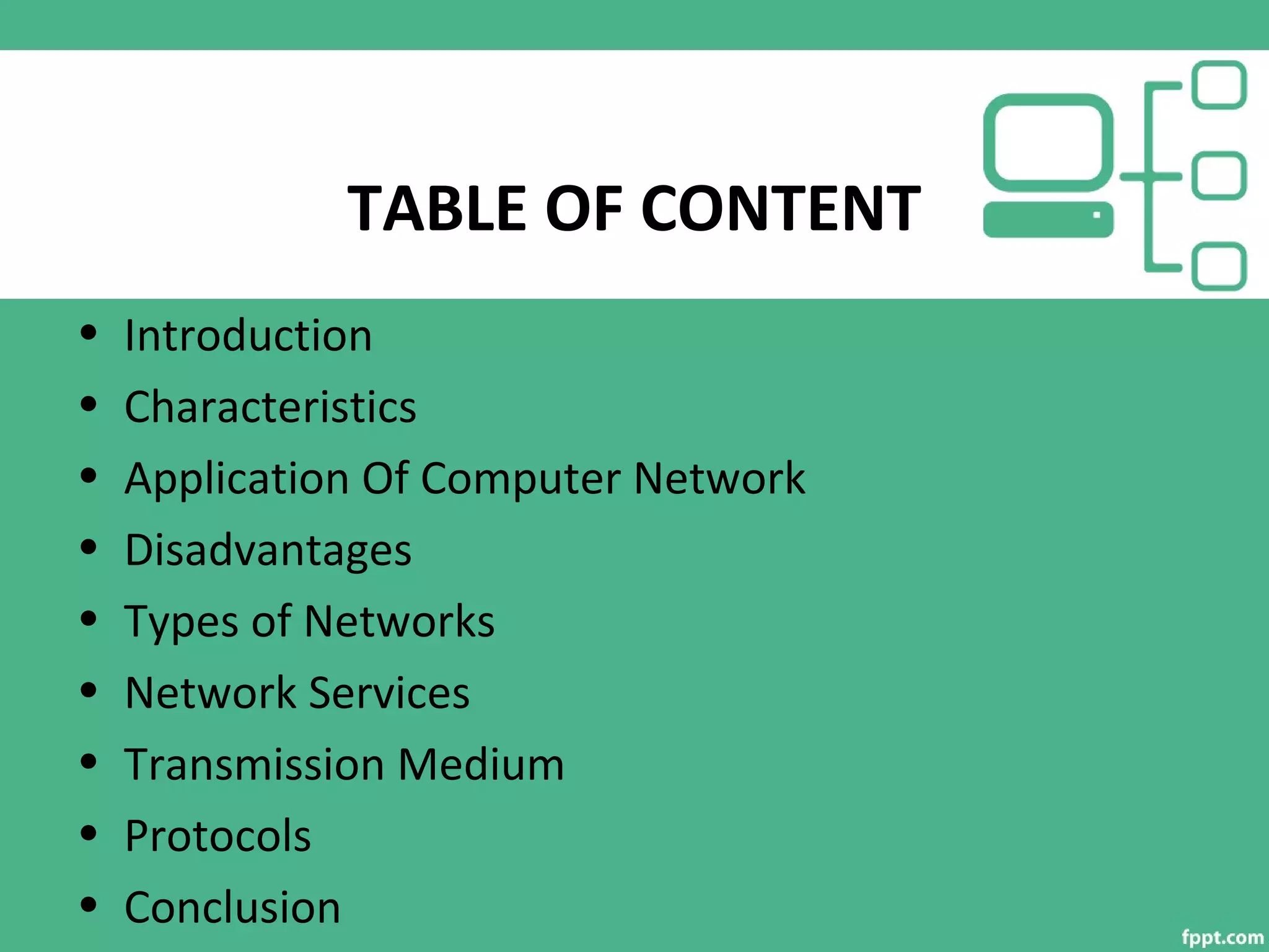This document provides an overview of computer networking, including its introduction, characteristics, applications, disadvantages, types of networks, network services, transmission mediums, protocols, and conclusion. It defines a computer network as a set of autonomous computers connected by a medium to exchange information. The document outlines different types of networks like LAN, MAN, and WAN and describes their key characteristics. It also discusses various network services, transmission mediums, and protocols that allow networks to function properly.