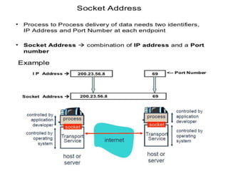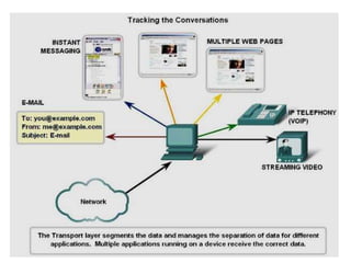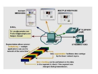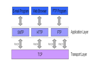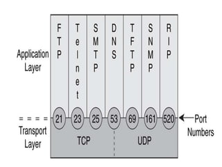 The document discusses computer networks and network protocols. It begins with an introduction to network protocols and the Internet protocols. It then provides definitions and explanations of communication protocols, including addressing, transmission modes, and error detection/recovery techniques. It lists and describes common network protocols like TCP/IP, routing protocols, FTP, SMTP, and more. It also discusses the OSI model layers, TCP/IP protocol suite, data encapsulation, protocol data units, protocol assignments to layers, and addresses at each layer.