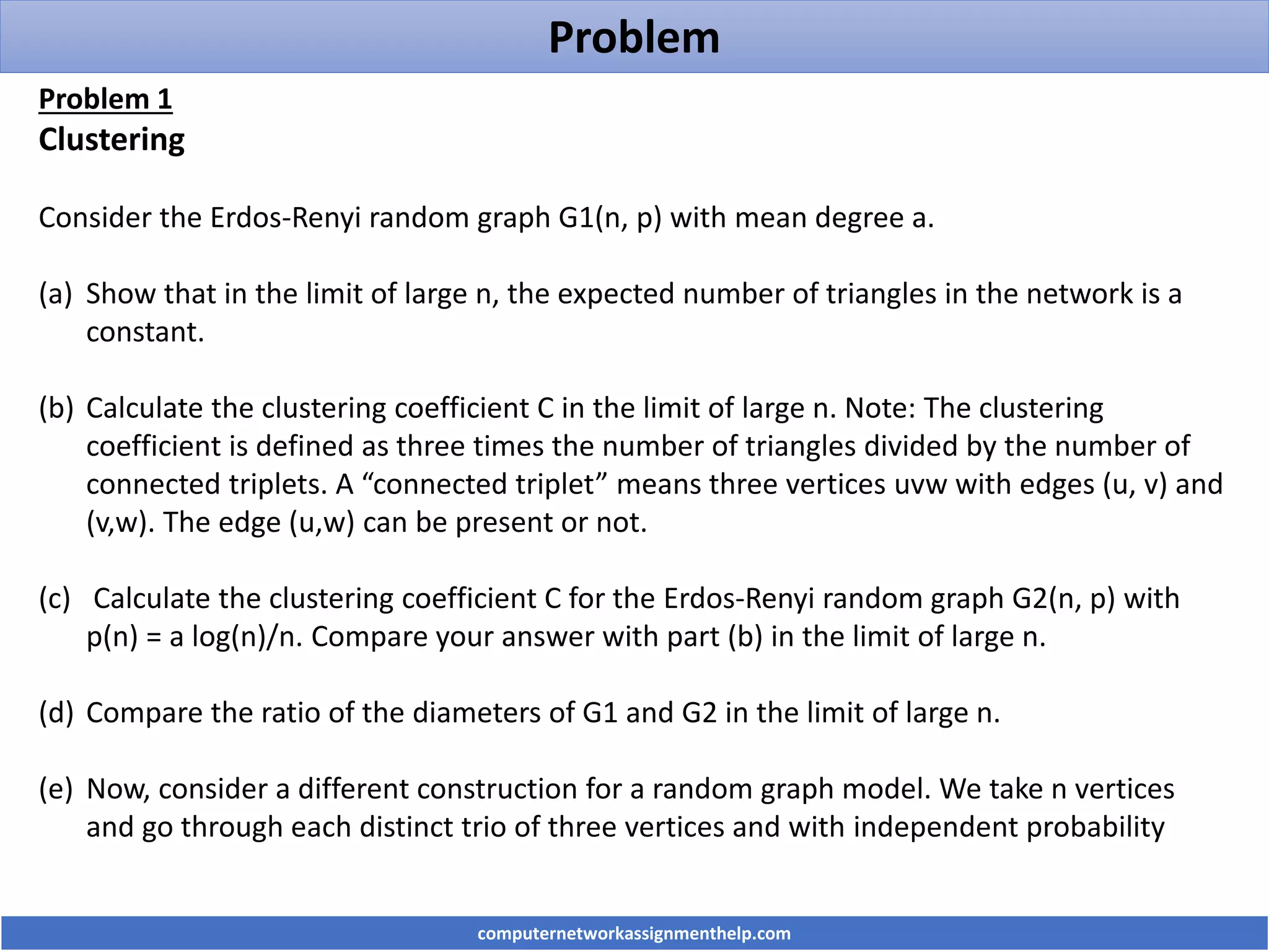 The document outlines various problems related to computer networks, including clustering in Erdős–Rényi random graphs, centrality measures in infinite graphs, and synchronization dynamics in a network of oscillators. Each problem involves theoretical concepts and calculations aimed at demonstrating properties of graphs and dynamical systems. The solutions detail computations of clustering coefficients, eigenvector centrality, and stability conditions for oscillatory systems.