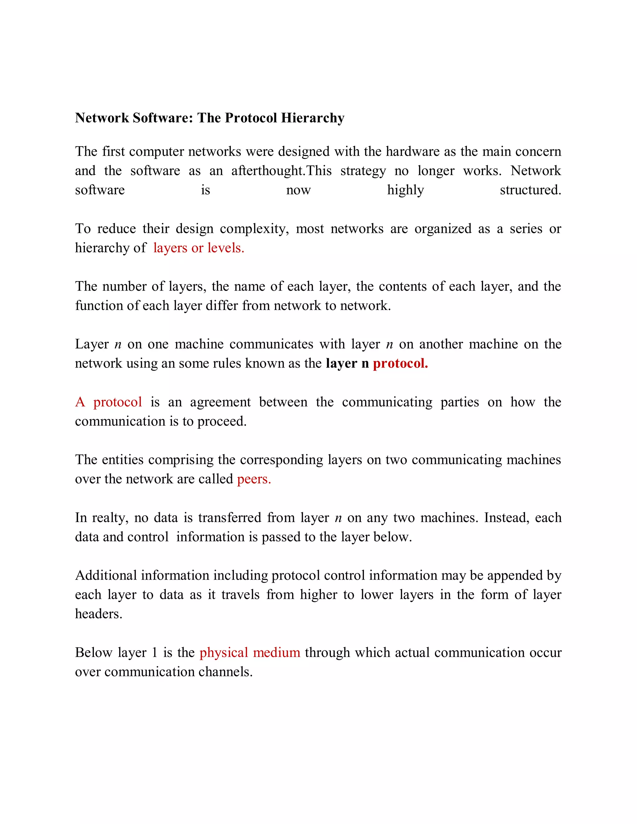 This document discusses the hierarchical structure of network software and protocols. It explains that networks are organized into layers, with each layer communicating with the same layer on other machines using protocols. Data is passed between layers down the hierarchy, with each layer able to add header information. The layers, protocols, and interfaces together make up the network architecture. Key issues addressed by different layers include addressing, error control, flow control, multiplexing/demultiplexing, and routing. Connection-oriented and connectionless services are described, as well as the service primitives each uses. Finally, the relationship between services and protocols is explained.