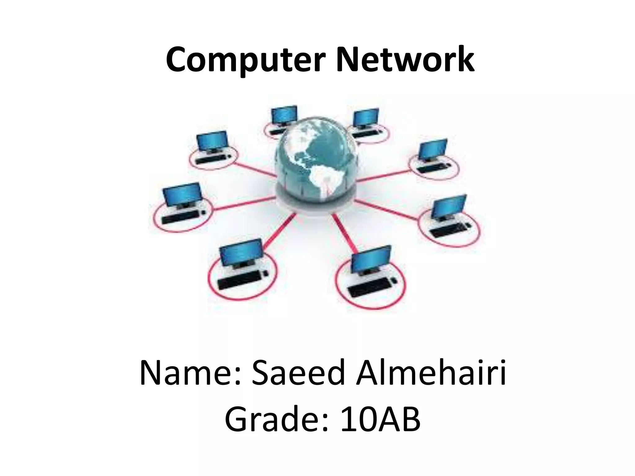 Saeed Almehairi is a 10th grade student studying computer networks. His document defines key network concepts including computer networks, network topologies, communication protocols, overlay networks, network interfaces, network links, Ethernet, wireless LANs, and cites Wikipedia as a source of information.