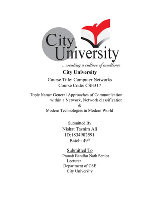 This document provides an overview of computer networks, including general approaches to communication, network classifications, and modern technologies. It discusses two main approaches to communication: client-server networks and peer-to-peer networks. It also defines and describes personal area networks (PAN), local area networks (LAN), metropolitan area networks (MAN), and wide area networks (WAN). Finally, it lists some modern technologies like smart homes, robotics, smart watches, virtual agents, and robotic process automation.