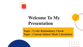 The document presents a presentation by group members on cyclic redundancy check (CRC) and custom subnet mask calculation. It explains CRC as an error detection method that utilizes a polynomial for reliable data transmission, detailing the process of generating and checking CRC at sender and receiver sides. Additionally, it introduces subnet masks and provides examples for calculating custom subnet masks based on network and device requirements.