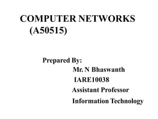 This document provides an overview of computer networks and networking concepts. It discusses protocols and standards including the elements of a protocol: syntax, semantics, and timing. It describes the OSI model and TCP/IP model in detail, explaining each layer and its functions. It also discusses different types of transmission media like coaxial cable, fiber optic cable, and wireless transmission. Coaxial cable uses a central conductor surrounded by insulation and an outer conductor. Fiber optic cable uses total internal reflection to guide light through the core. Wireless transmission uses electromagnetic waves propagated through ground, sky, or line-of-sight methods using antennas.