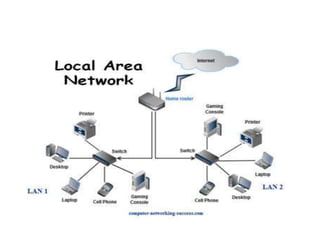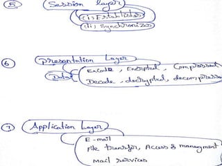 The document outlines key components of computer networks including messages, senders, receivers, mediums, and protocols. It details various topology types (bus, star, ring, mesh), connection types (point-to-point, multipoint), and categories of networks (LAN, MAN, WAN), as well as the ISO/OSI model layers and transmission media like coaxial and fiber optic cables. Additionally, it covers network devices such as bridges and firewalls, explaining their functions and advantages.