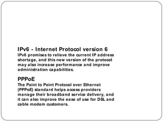 Computer networking devices allow computers to communicate over a network. A network interface card (NIC) connects each computer to the network. Hubs connect multiple devices and broadcast all data to every port. Switches examine destination addresses and forward frames to the specific port, improving efficiency over hubs. Routers connect different networks and determine the best route to forward packets between networks.