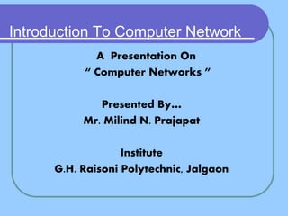 This presentation introduces computer networks, covering definitions, classifications (LANs, WANs, MANs), networking advantages and disadvantages, and network topologies (bus, star, ring, mesh). It discusses the roles of various components including clients, servers, repeaters, hubs, bridges, routers, and switches, highlighting their functions and importance in network communication. The presentation emphasizes the significance of understanding networking concepts for effective resource sharing and communication.