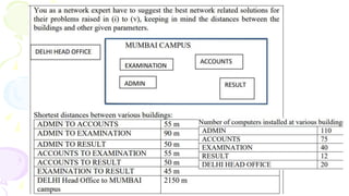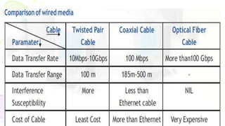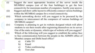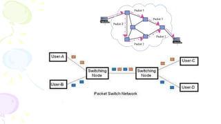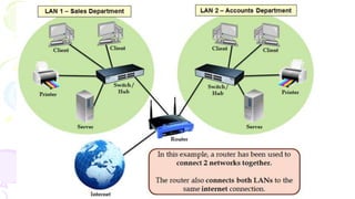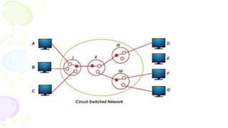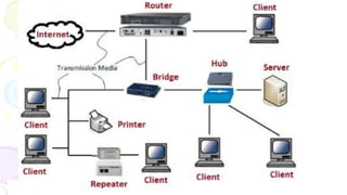 This document provides an overview of computer networks. It begins by discussing how computer networks have changed daily life through services like watching cable TV, using ATMs, emailing, and more. A network is defined as two or more connected autonomous computers. The goals of networking are sharing resources, improved communication, and reduced communication costs. Networks have senders, receivers, messages, transmission mediums, and protocols. Early networks included ARPANET and NSFNET. The internet evolved from these and allows globally connected services. Network topologies like star, bus, and types of devices like hubs, switches, and routers are also summarized.