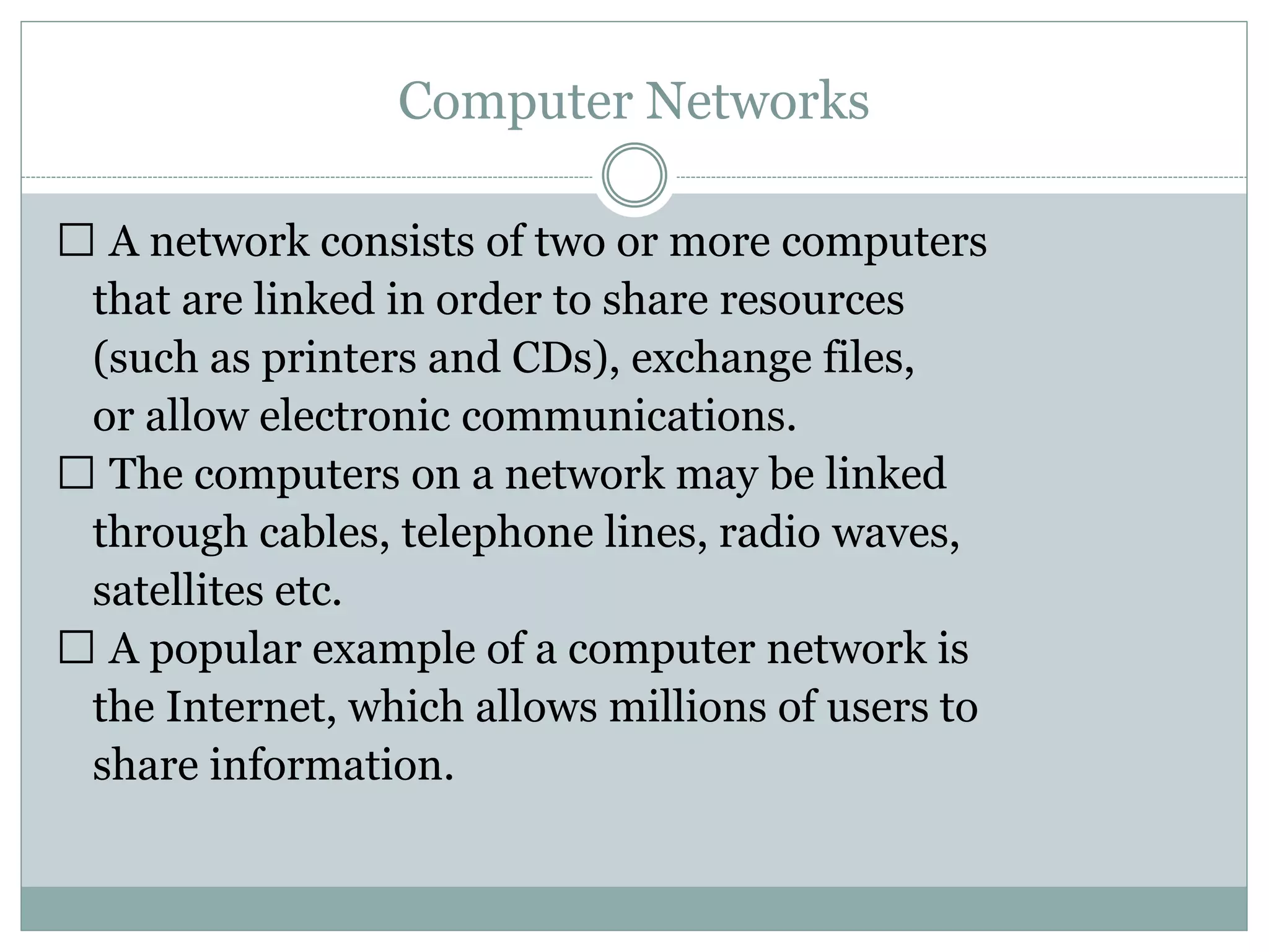 Computer networks consist of linked computers sharing resources, files, and communication, utilizing various transmission media. They provide benefits such as file and resource sharing, flexible access, and personal communication, with applications in email, e-commerce, and video conferencing. Ethernet defines the standards for local area networks, including specifications for cabling and data transfer.