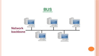 The document provides an overview of computer networks, detailing network definitions, components, and types including LAN, MAN, WAN, and PAN. It elaborates on various network topologies such as bus, ring, star, mesh, and hybrid topology, highlighting their advantages and disadvantages. Key points include the function of each topology, the necessary components for implementation, and the typical use cases for different network configurations.