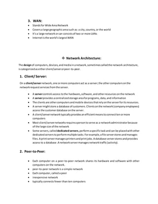 The document provides an overview of computer networks, discussing their definitions, classifications (LAN, MAN, WAN), architectures (client/server and peer-to-peer), and topologies (bus, ring, star, mesh, tree). It details various network communications standards such as Ethernet, Wi-Fi, and Bluetooth, explaining their functionalities and applications. Additionally, the document covers the setup and benefits of home networks, including wired and wireless options.
