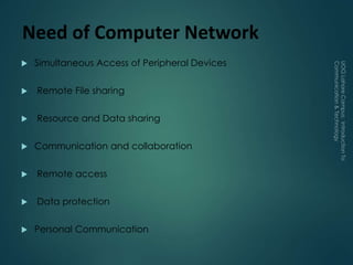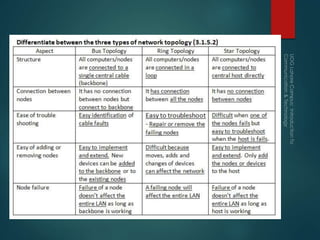 The document discusses various topics related to computer networks including the need for networks, importance of networks, solutions for sharing resources over a network like site licenses and network versions of software. It also covers different types of network topologies - star, bus, ring and mesh. The star topology allows devices to connect to a central hub, making it easy to install but failure of the hub disables all devices. The ring topology arranges devices in a closed loop but failure of a single node breaks the entire network. The mesh topology connects all devices directly but requires extensive cabling. Finally, it notes considerations for choosing a suitable topology include cost, cable requirements and ability to support future growth.