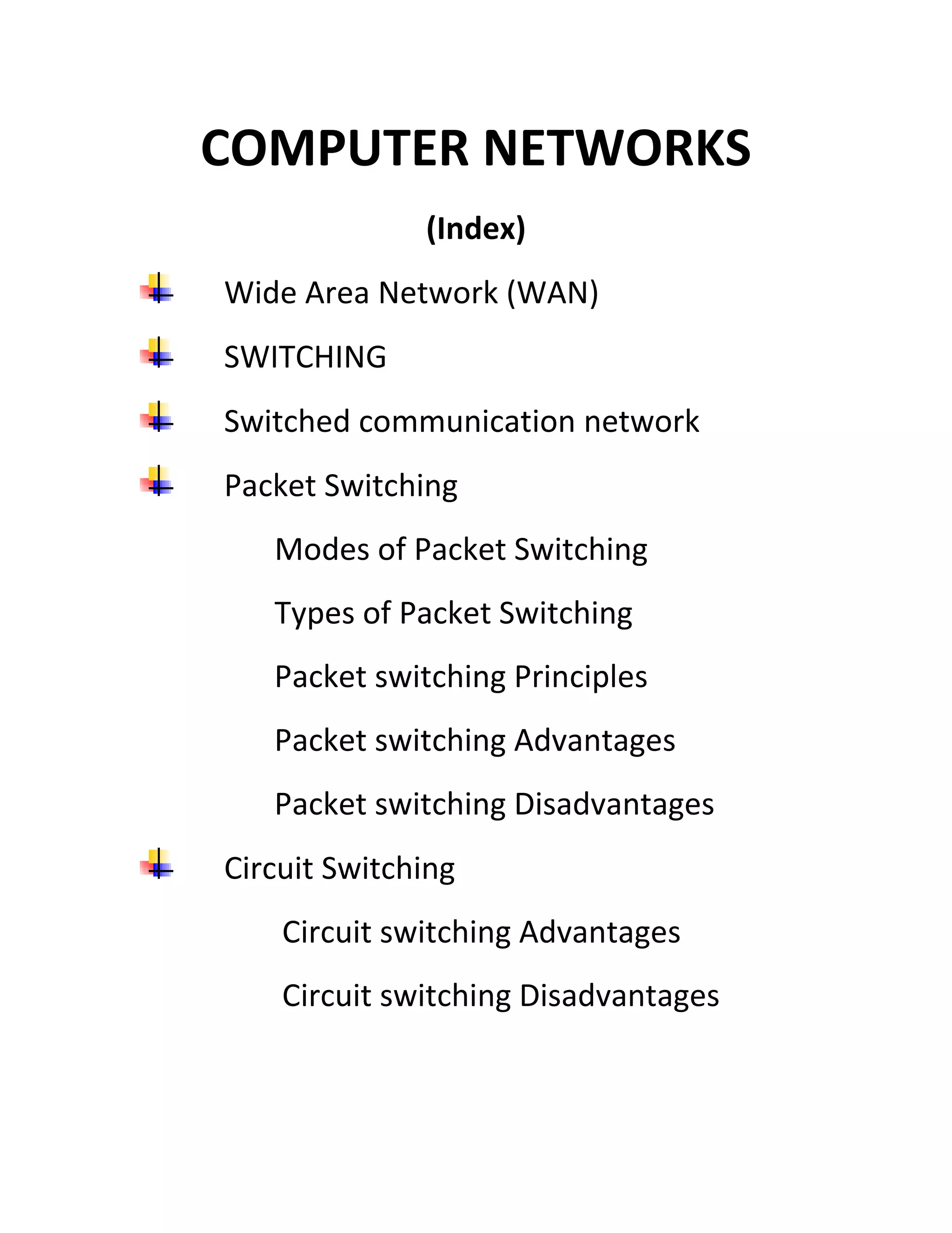 Wide area networks connect smaller networks over large geographical areas. Packet switching is the dominant switching method used, breaking data into packets that are routed independently to their destination. There are two main types of packet switching: connection-oriented uses virtual circuits to establish dedicated paths for packets to follow, while connectionless treats each packet independently without pre-establishing paths. Packet switching provides more efficient use of network bandwidth compared to circuit switching.