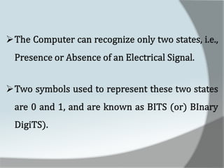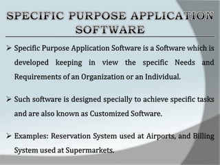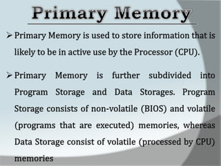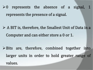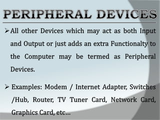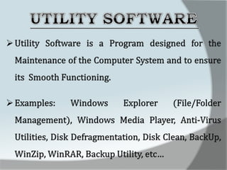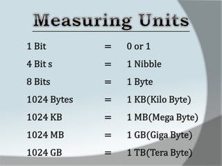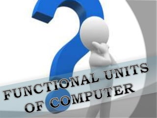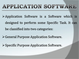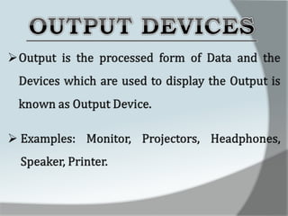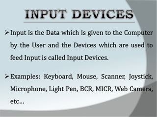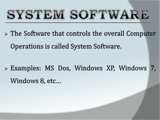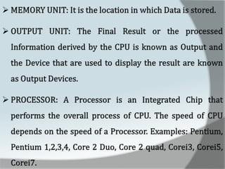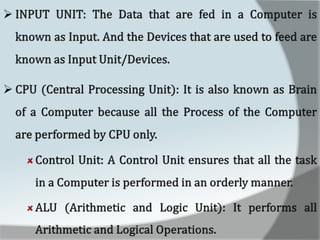 A computer is an electronic device that accepts data as input, processes it, and produces output. It has four main functions: input, processing, output, and storage. Hardware refers to the physical components like keyboards, monitors, and hard drives. Software gives computers their functionality and includes operating systems, applications, and utilities. The central processing unit controls the main components and allows data and instructions to flow through the computer.