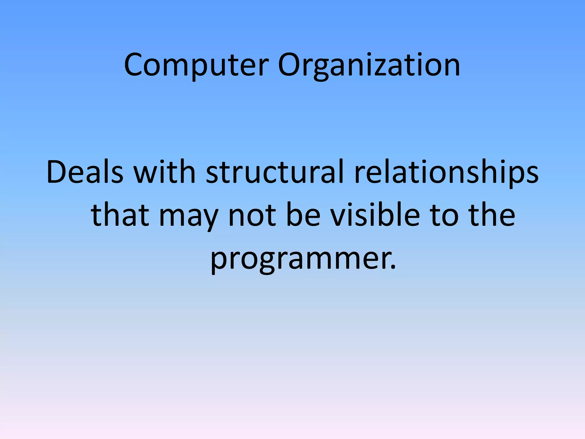 The document summarizes the history and basic components of computer organization. It discusses the earliest computing devices like the wolf radius bone and abacus, followed by pioneering machines like Pascal's calculator, Babbage's Difference Engine, and the Jacquard loom. It then covers important computers like the Enigma, Colossus, and ENIAC. The document also introduces Moore's law and the von Neumann model. Finally, it outlines the basic operations of a computer system as input, storage, processing, output, and control.