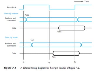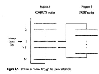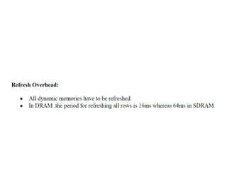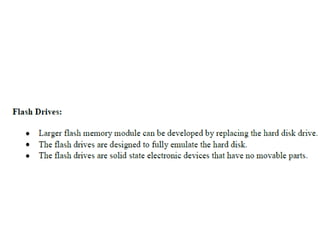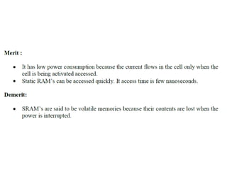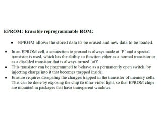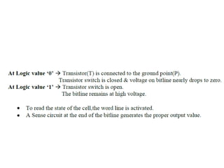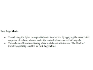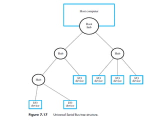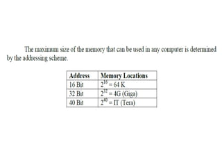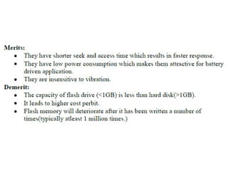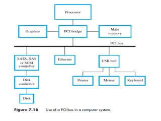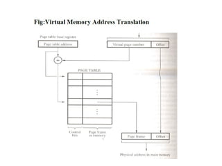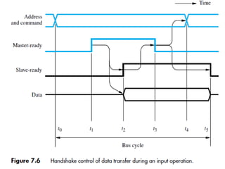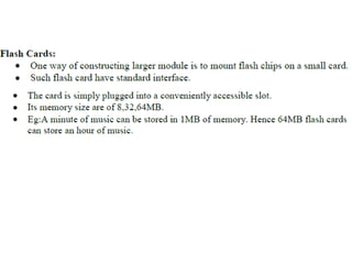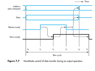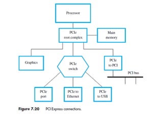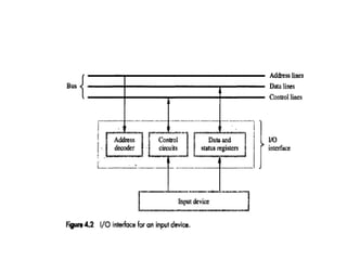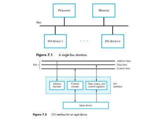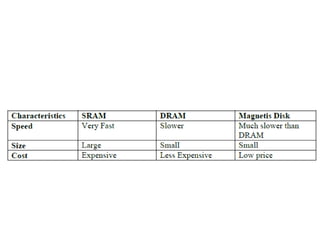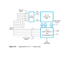 The document discusses memory hierarchy concepts including cache, RAM, and virtual memory, detailing their characteristics and performance. It covers various types of memory mapping, replacement algorithms, and how cache mechanisms function to enhance processor efficiency. Additionally, it addresses the organization of secondary storage, access techniques, and I/O interfacing methodologies for efficient data transfer.