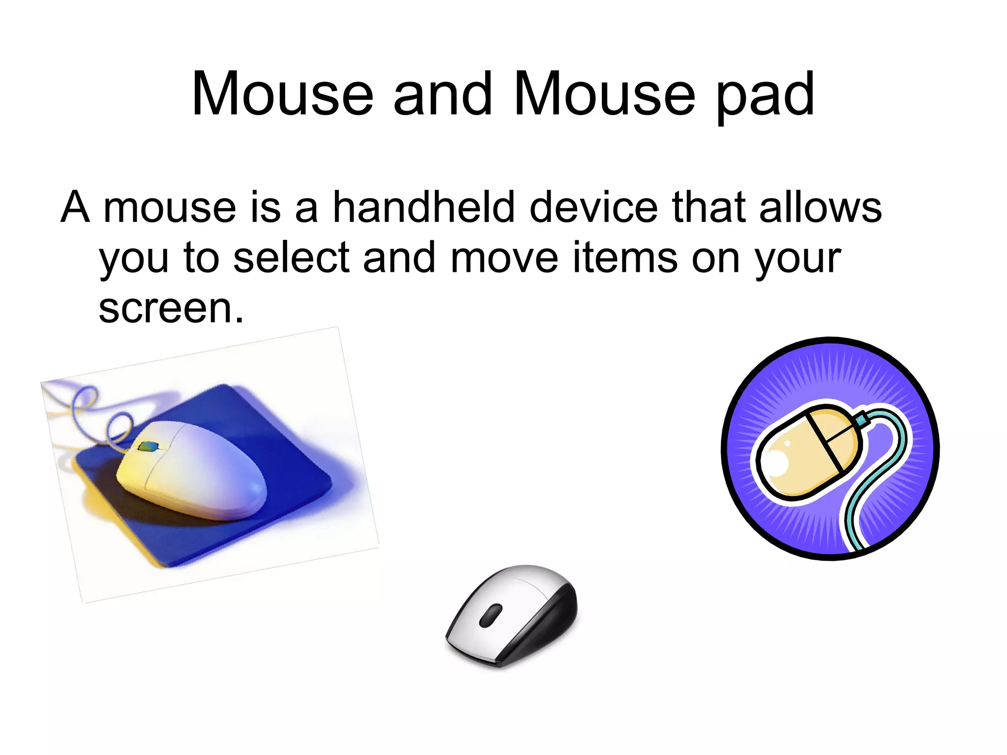 The document identifies and describes common computer parts including the mouse, keyboard, printer, monitor, modem, scanner, central processing unit, hard drive, floppy drive, flash drive, word processor, e-mail, internet, and computer games. It notes that working with computers and the internet can be difficult at first but becomes easier with practice and learning how to use different programs and control the internet.
