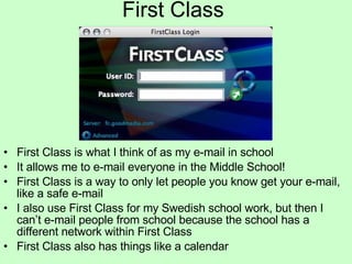 The document discusses several computer-related topics: First Class, an email and calendar service used by the student's school; I-Google, a website that allows accessing email and RSS feeds; E-Mac computers, which are described as easy to use but lacking games; Blogger, a blogging platform where anything posted can be viewed publicly so privacy is important; and wikis like Computers Wiki and Wikispaces, which are helpful for sharing assignments and making up work missed in class.