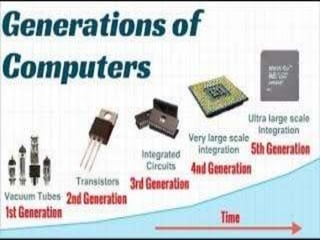 The document discusses the six generations of computers from 1946 to present. The first generation used vacuum tubes that produced a lot of heat. The second generation used transistors instead of vacuum tubes. The third generation used integrated circuits which had many transistors on a single chip. The fourth generation used VLSI circuits with thousands of transistors on a single chip enabling microcomputers. The fifth generation was a Japanese initiative to create massively parallel computers using logic programming. The sixth generation Intel processors deliver enhanced performance at low power levels and support various device designs from mobile to desktops.
