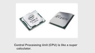 A computer is an electronic device that accepts data as input, processes it, and provides output. It is composed of various electronic components like resistors, capacitors, transistors, and microchips connected by wires or cables. A basic computer consists of a central processing unit for calculations, a keyboard for inputting data, and a monitor for displaying output.