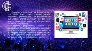 The document introduces computer programming as a crucial aspect of everyday technology, detailing its role in creating applications and software. It explains the process and responsibilities of computer programmers, including writing, testing, and modifying code. Additionally, it lists various programming languages and their specific applications in different fields.