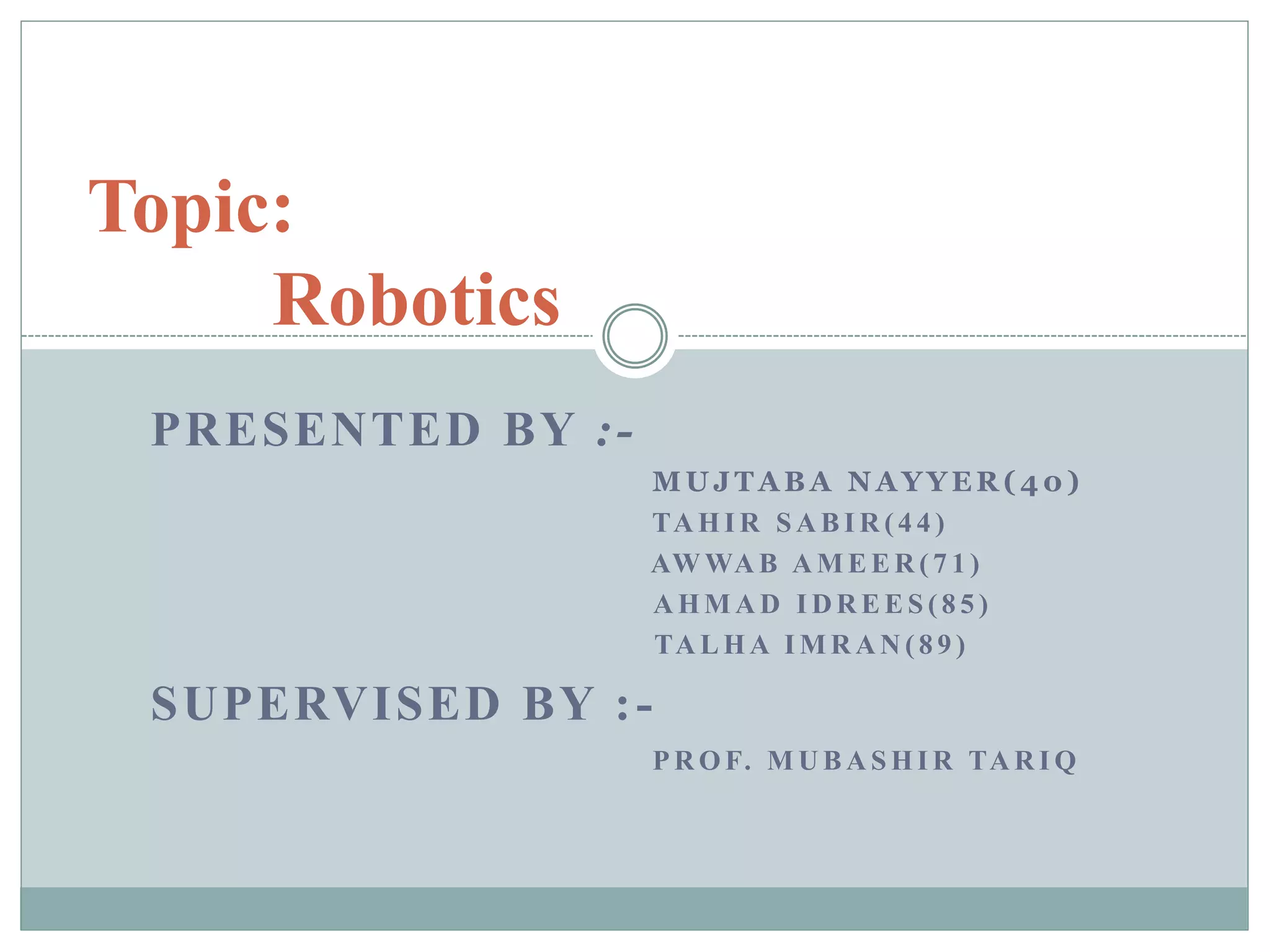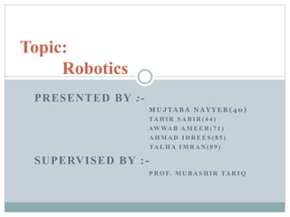 This presentation discusses robotics and was presented by 5 individuals supervised by Prof. Mubashir Tariq. It defines robots and covers the history of robotics. The main types of robots are described including industrial, wheeled, legged, swimming, flying, micro, and nano robots. The key components of robots and advantages like increased output are outlined. Disadvantages, laws of robotics, problems with robots, and the future of robotics are also examined. The conclusion discusses contributions to soft robotics modeling and control.