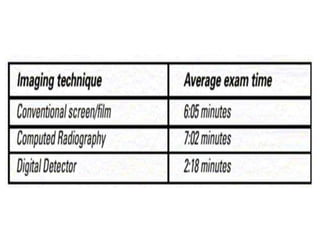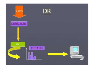 The document compares computed radiography (CR) and digital radiography (DR). CR uses imaging plates that are scanned after exposure to produce images, similar to conventional film but with digital output. DR directly captures digital images using flat panel detectors or CCD cameras, allowing for immediate viewing and faster workflow. DR provides advantages like decreased radiation exposure and costs compared to CR and conventional film due to digital processing and elimination of chemical processing. Both CR and DR represent advancements over conventional film radiography by producing digital images.