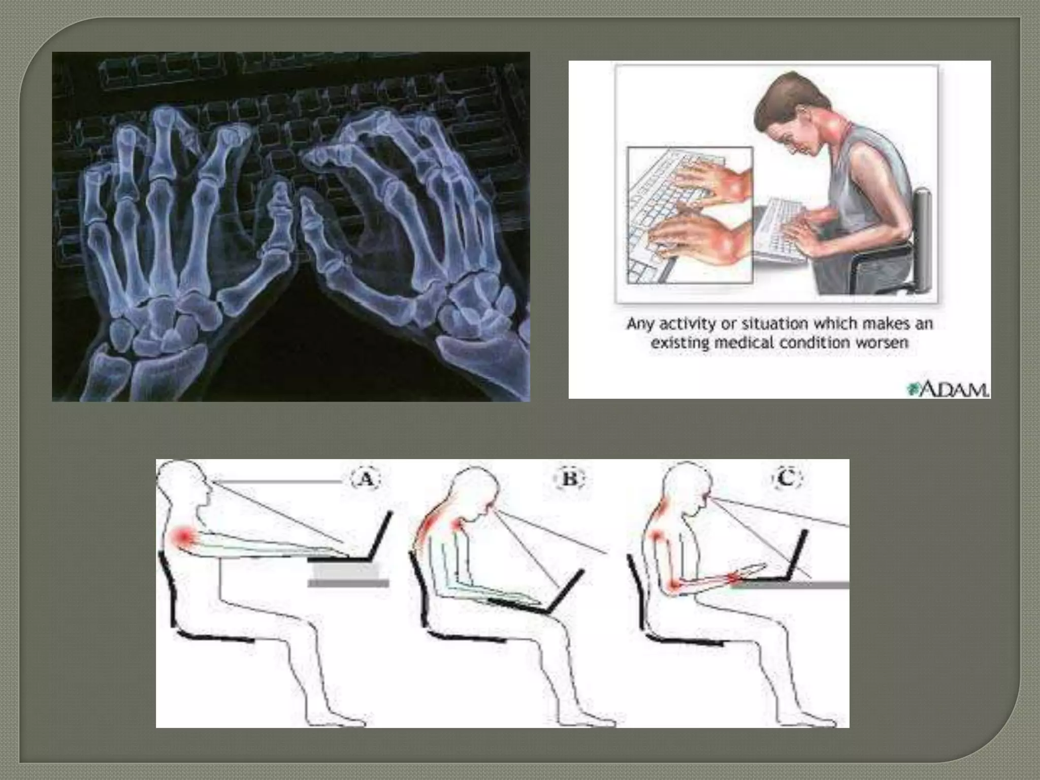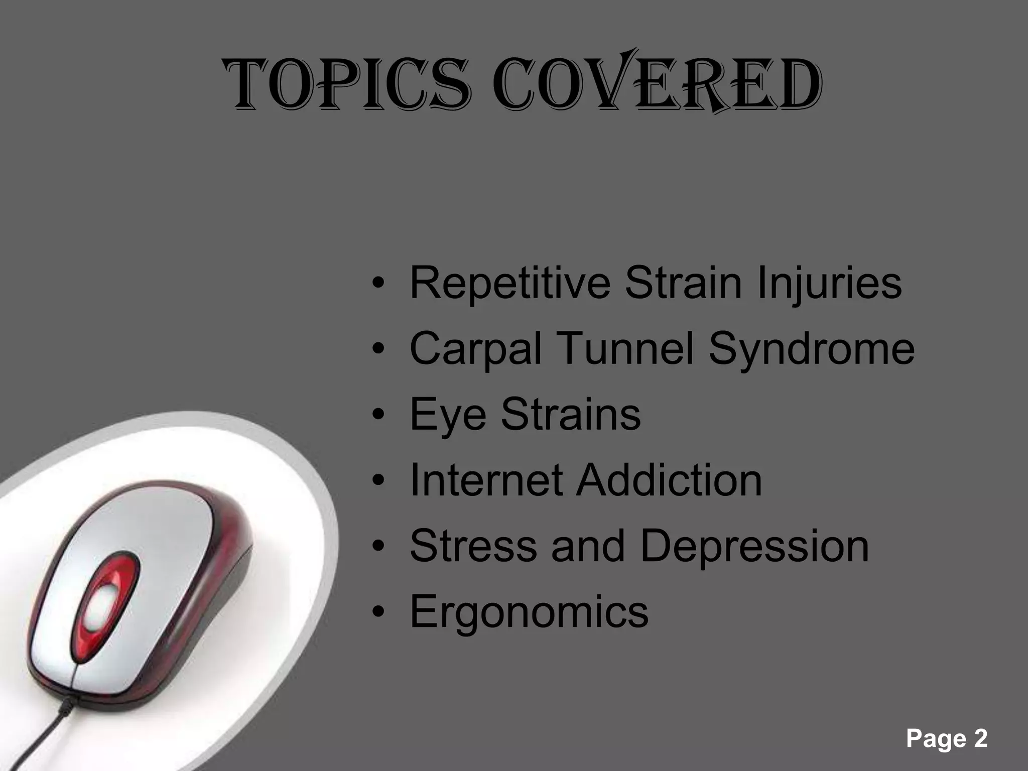 This document discusses various computer-related health hazards such as repetitive strain injuries, carpal tunnel syndrome, eye strains, internet addiction, stress, and depression. It covers the causes and symptoms of these issues as well as treatments and preventative measures through proper ergonomics. Specifically, it notes that repetitive strain injuries affect over 7 million computer users annually in the US and outlines specific ergonomic adjustments that can be made to a workstation, such as adjusting the monitor height, desk level, chair position, and keyboard placement. The document emphasizes taking breaks, exercising hands and arms, and using ergonomic principles to reduce computer-related health risks.