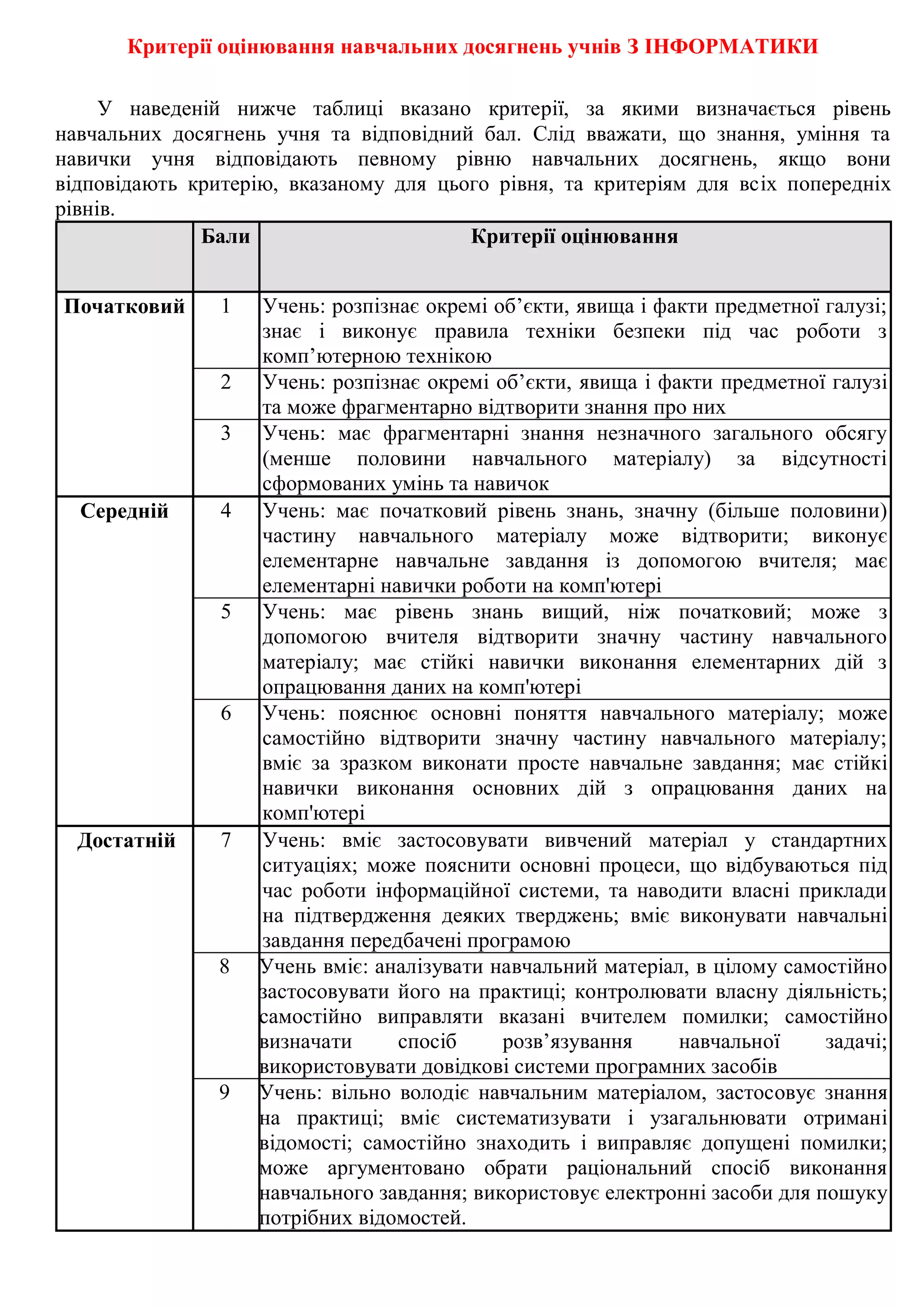 Критерії оцінювання навчальнихдосягнень учнів З ІНФОРМАТИКИ
