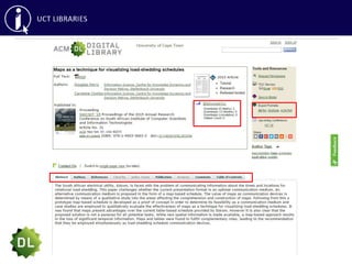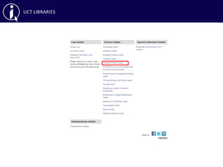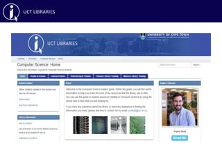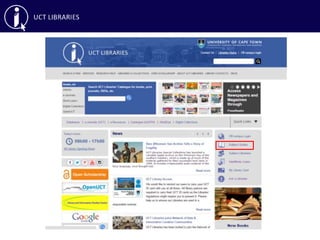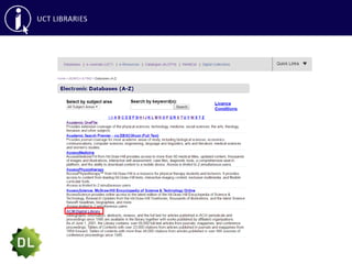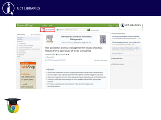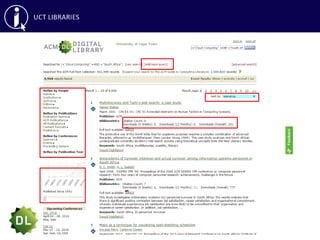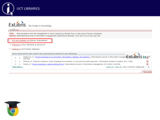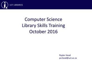 This document provides an overview of library skills training on effective searching, reference managers, and accessing articles not subscribed to by UCT Libraries. It discusses searching databases like Google Scholar, ACM Digital Library, IEEE Xplore and using keywords, boolean operators and other search techniques. It also covers reference managers RefWorks and EndNote for organizing citations, as well as interlibrary loans and open access repositories for obtaining articles not available through UCT.