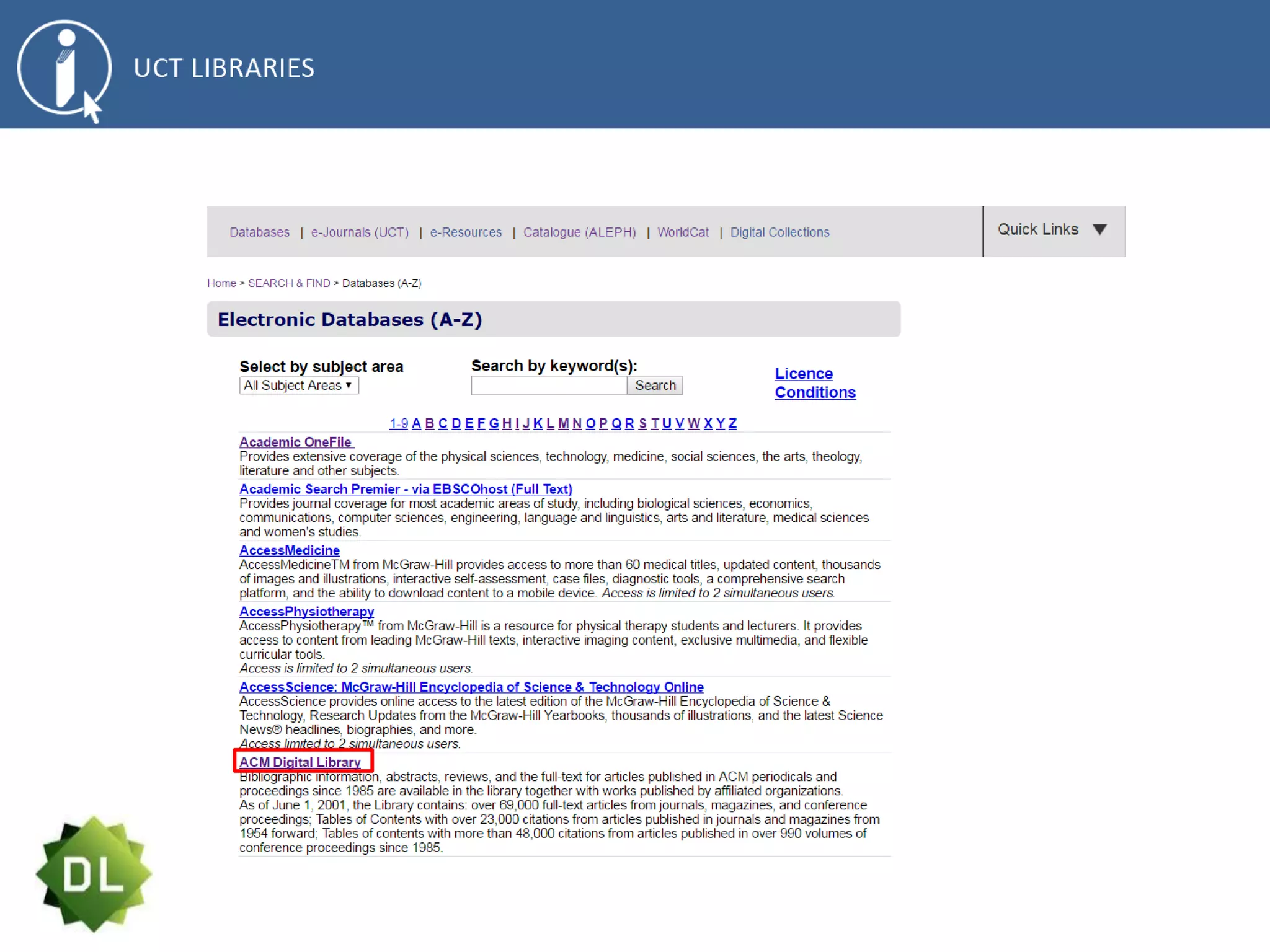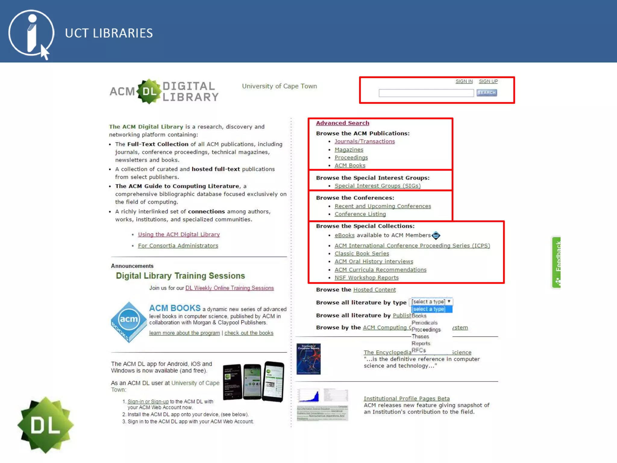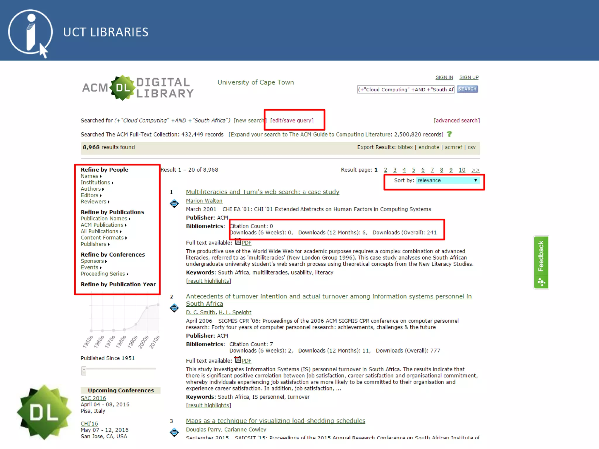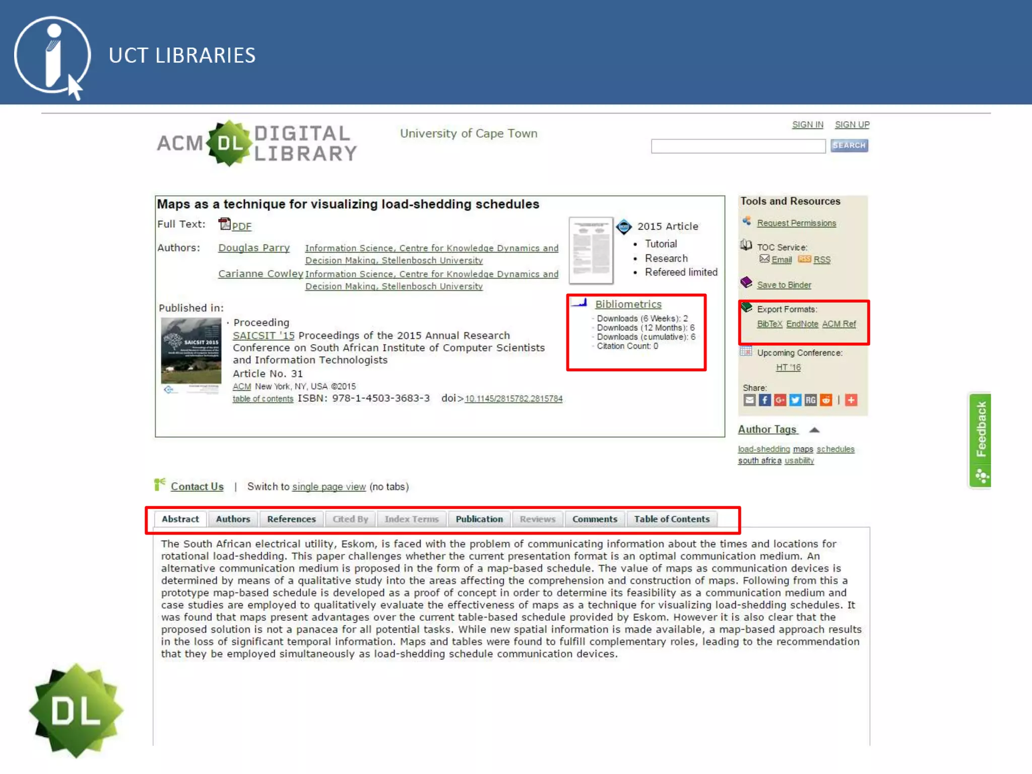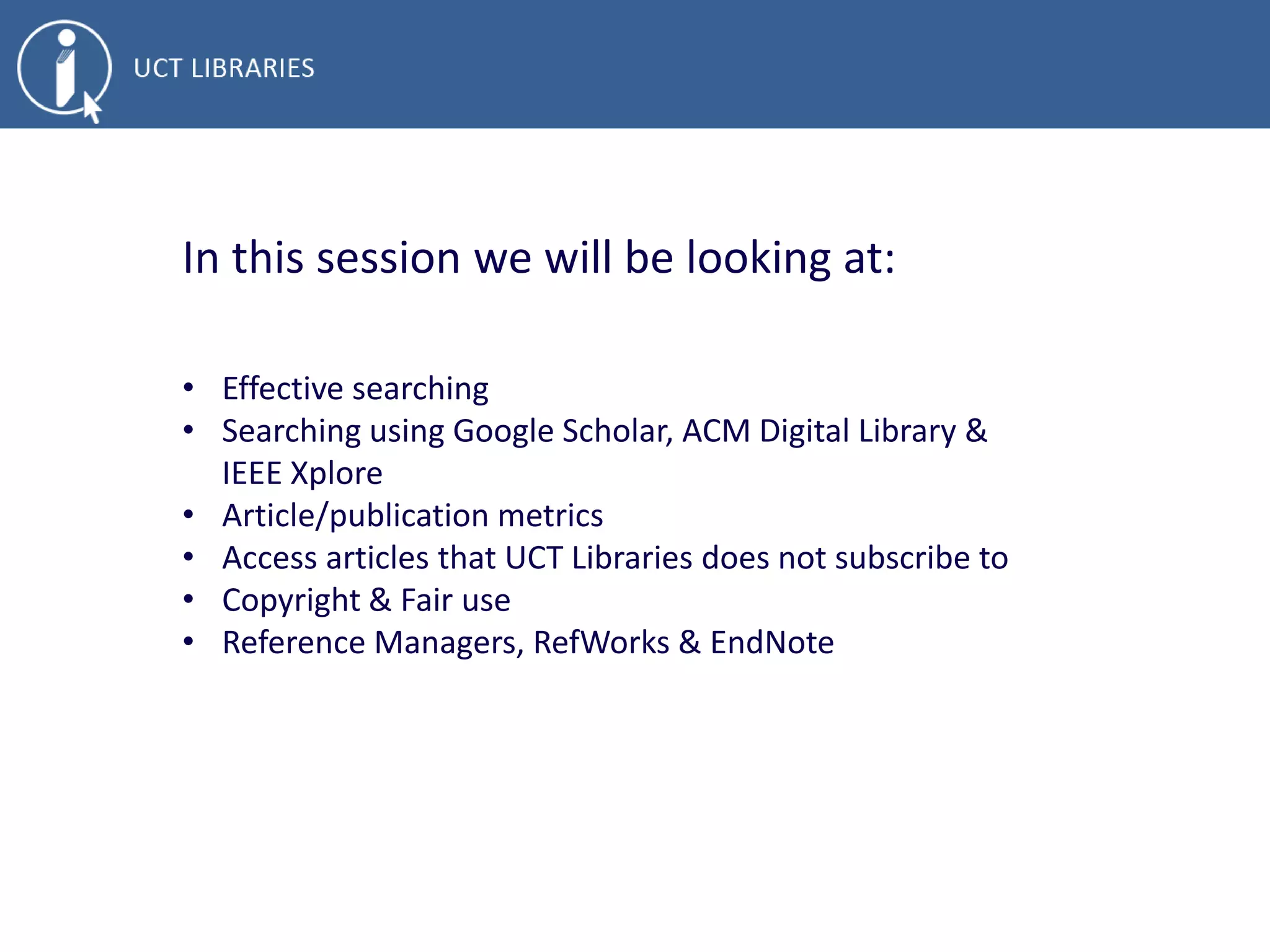 This document provides an overview of a computer science library skills training session on effective searching techniques. It discusses searching databases like Google Scholar, ACM Digital Library, and IEEE Xplore. It covers using keywords, Boolean operators, and other search techniques. It also addresses metrics like citations and downloads for evaluating sources. Additionally, it summarizes accessing articles not available through UCT libraries, copyright, and reference managers.