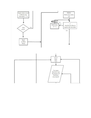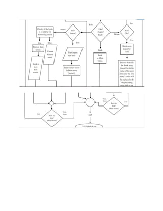 The document is a computer science project report for a Library Management System created by Lokesh Meena, a class 11 student at Kendriya Vidyalaya Sector-2 R.K. Puram, guided by Ms. Swati Saxena. It includes sections such as acknowledgements, requirements, source code, functions with their purposes, and a flowchart that detail the system's functionality, including book and student record management features. The system allows librarians to manage books, issue and deposit them, and maintain records with various functionalities like modifying and deleting records.