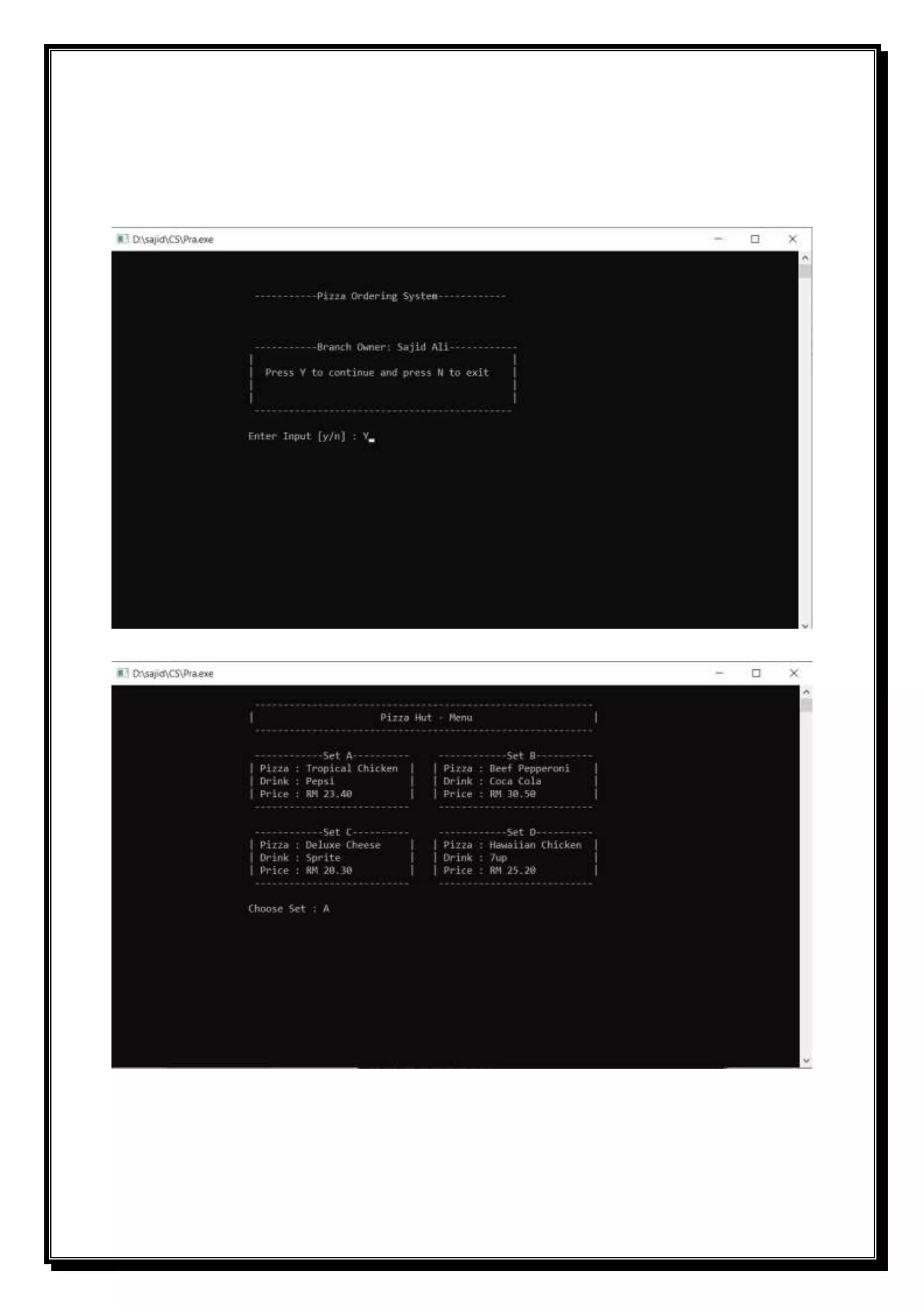 This document contains the source code and documentation for a Pizza Ordering Management System project created by Sajid Ali. The project allows users to select from pizza sets A through D, input the quantity, make a payment, and print a receipt. The code is written in C++ and makes use of header files for input/output, string handling, and other functions. It contains menus, switch statements to handle set selection and payment processing, and output sections to display orders and receipts.